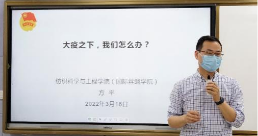 随后,党委副书记方平老师以“大疫之下,我们怎么办?”为主题,为同学们上了一堂精彩的主题团课。方老师以“共青团员是什么”为出发点,为我们讲解了疫情之下共青团员应当承担的社会责任和义务,指出新冠疫情既是对人性的考验,也是对国家的考验,唯有家国天下的情怀、以民为本的理念和民族大团结,方能共克时艰。虽然疫情笼罩下的防疫工作日趋常态化,给我们的学习和生活带来了诸多不便,但我们更应顺势而为,迎难而上,合理规划时间。