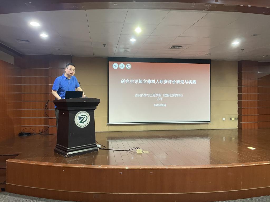(国际丝绸学院)研究生导师立德树人职责评价办法》,期间,他结合前期研究和调查实践,系统解读《关于全面落实研究生导师立德树人职责的意见》、《研究生导师指导行为准则》等文件精神,阐明评价办法产生机制的政策导向,并从过程性、导引性、多维性和发展性四个方向对研究生导师立德树人职责评价办法三级指标进行“实战式”解读。