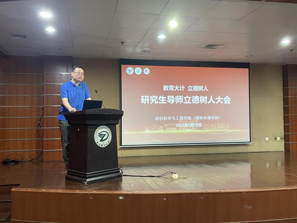 (国际丝绸学院)在大剧院三楼报告厅举行首届“研究生导师立德树人大会”。研究生院院长傅雅琴,学院党政班子,全体研究生导师、研究生辅导员和研究生教学秘书参加,会议由党委副书记、纪委书记方平主持。
