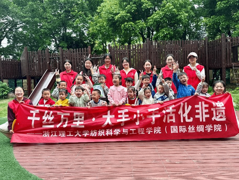 (国际丝绸学院)“三丝”励志服务队志愿者们与研究生染整第二党支部党员,共同策划实施以“千丝万里·大手小手活化非遗”为主题的活动,让小朋友们近距离欣赏、体验非遗文化的魅力,在幼小的心灵播撒保护传承非遗文化的种子。