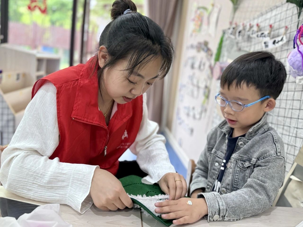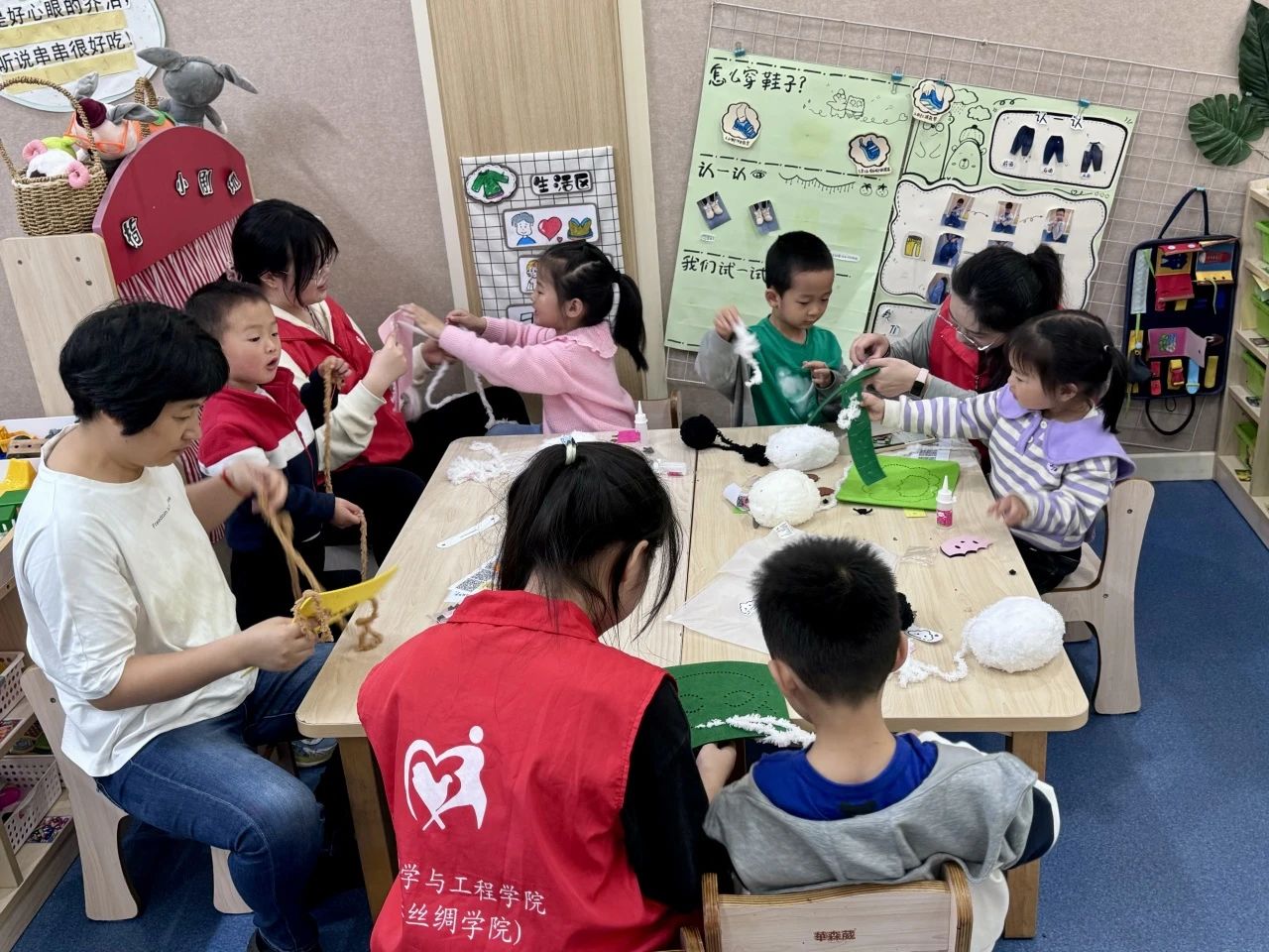 活动现场,学生们用拟象化的方式为小朋友们介绍辽绣满绣、山西钩编等纺织非遗文化。生动有趣的表现形式一下勾起小朋友们的好奇心,大家积极主动地和学生们交流提问。“我知道刺绣!我的衣服上就有一个小兔子样式的刺绣!”来自大班的一位小朋友看到刺绣的介绍时马上举手和讲解的学生进行互动。在随后的刺绣手工课上,小朋友们认真学习穿针、引线、缝工等基本技法,大家兴高采烈地拿起缝工板,在学生们的引导帮助下,一个个有模有样的刺绣作品在小朋友们的创作下相继诞生。