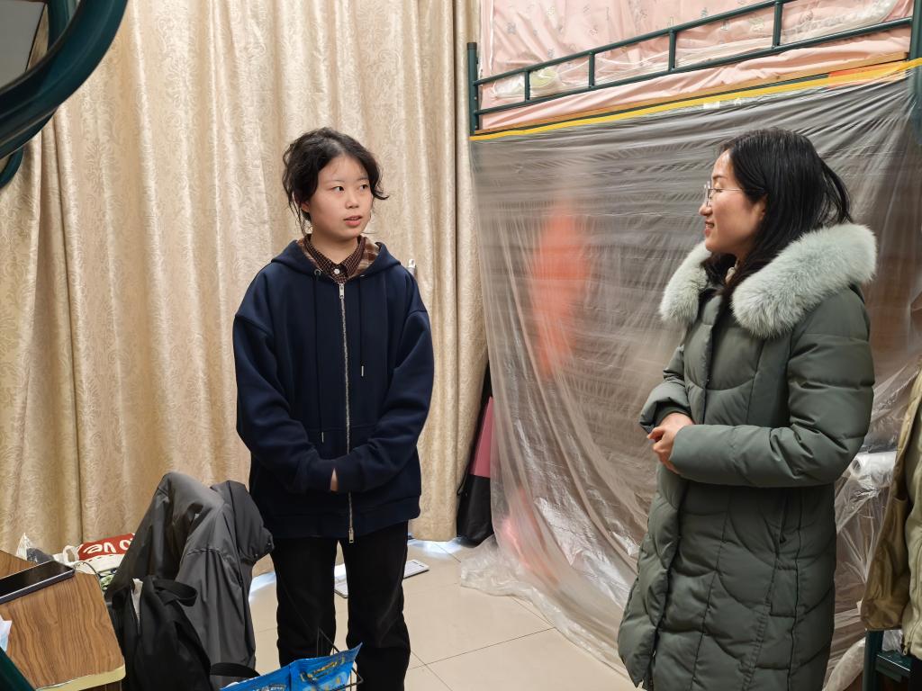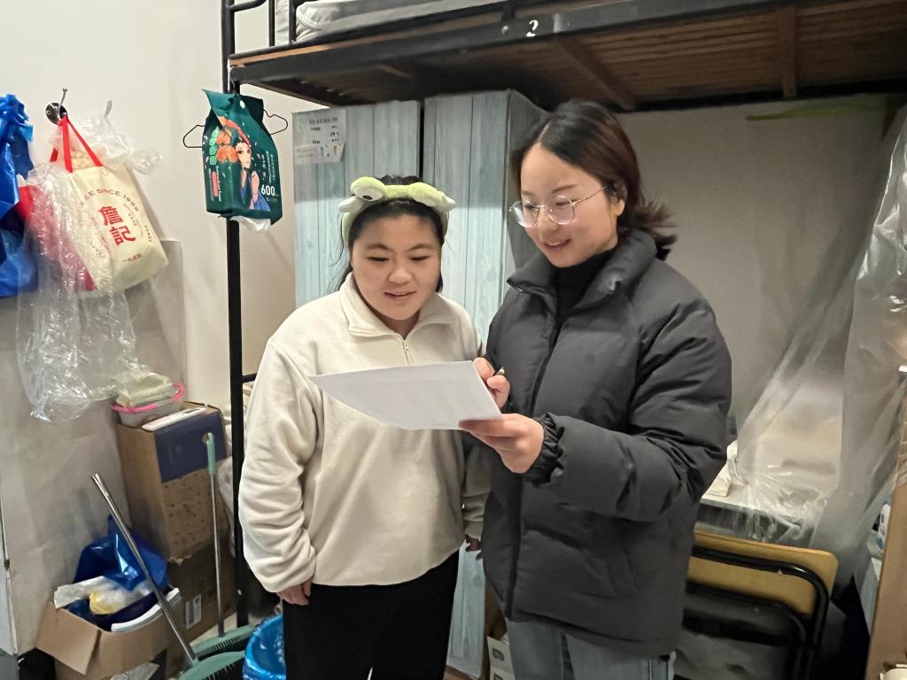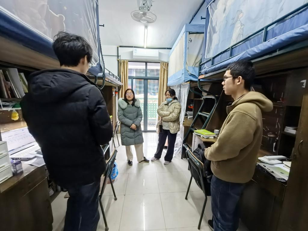 张孝凤一行走进学生宿舍,亲切询问同学们的假期生活及新学期规划,并重点提醒学生注意宿舍安全、交通安全,加强自我防护意识。结合学院近期开展的“访企拓岗”行动,鼓励同学们提前规划职业方向,充分利用校企合作资源提升实践能力。她强调:“新学期要以饱满的精神状态投入学习,积极参与校园活动,同时注重宿舍文化建设,共同营造和谐向上的生活氛围。”