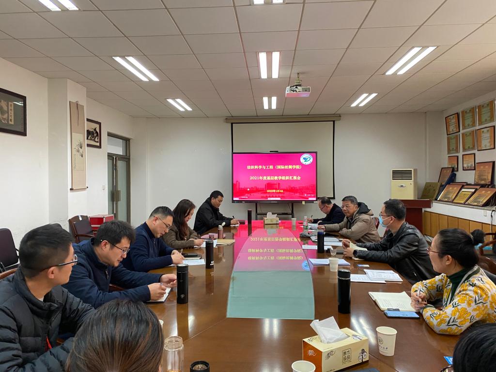 1月4日,纺织(丝绸)学院在17号楼312会议室召开2021年度基层教学组织汇报会。学院领导班子,综合办、教科办、学工办主任,系主任和教师代表参加了会议。