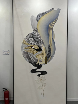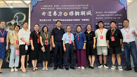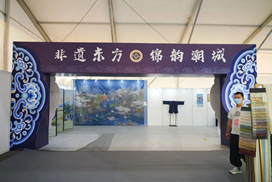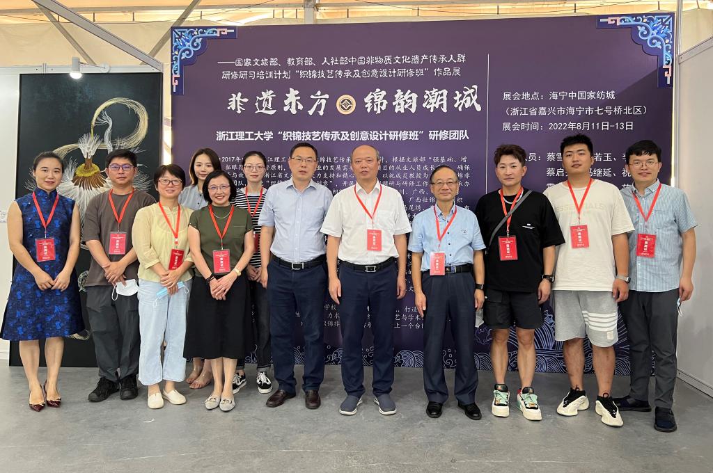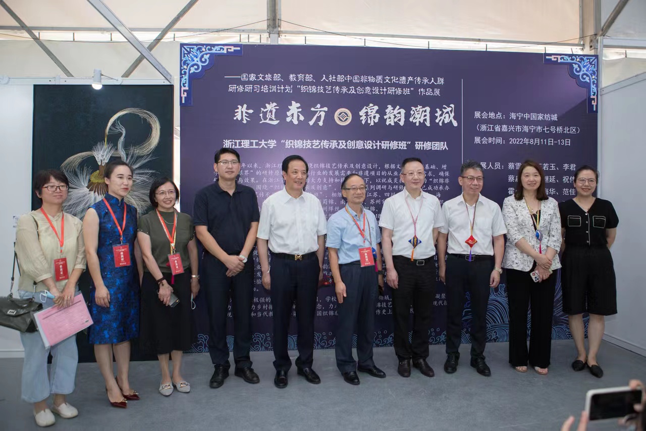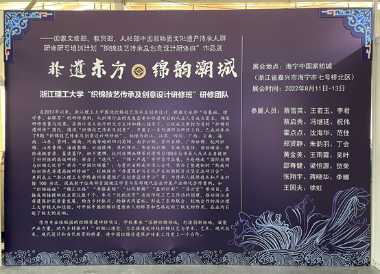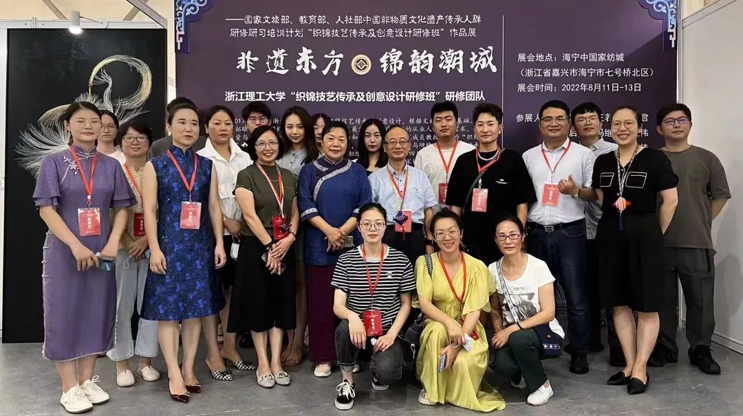 为传承织锦非遗技艺,促进非遗元素与家纺产品融合发展,以人妻 祝成炎教授为首的“织锦非遗研修”团队,围绕“织锦技艺传承及创意”,开展了一系列调研与研修工作。国家文旅部、教育部、人社部中国非物质文化遗产传承人群研修研习培训计划“织锦技艺传承及创意设计研修班”作品展“非遗东方•锦韵潮城”于2022年8月11日至8月13日亮相2022海宁中国•国际家用纺织品(秋季)博览会。