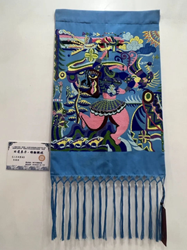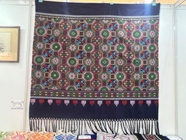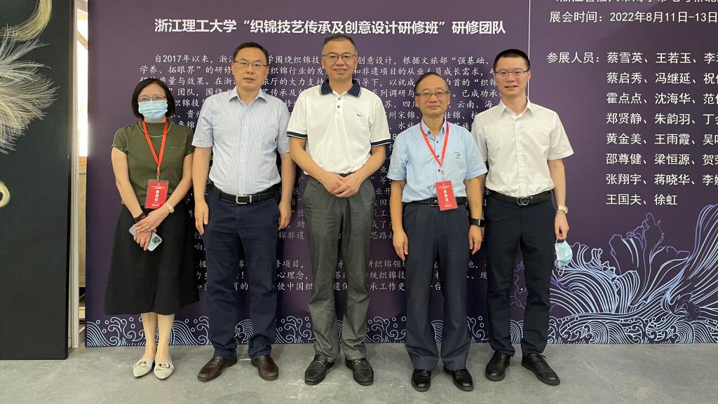 研修项目负责人祝成炎教授向参观展览的领导嘉宾介绍了本次参展作品,人妻 大学人妻 (国际丝绸学院)在纺织非遗传承和保护方面所做的工作,以及研修班学员在完成研修班学习之后在技艺和产品创新中所取得的成果。自2017年以来,人妻 大学围绕织锦技艺传承及创意设计,根据文旅部“强基础、增学养、拓眼界”的研修原则,从织锦行业的发展需要和非遗项目的从业人员成长需求,确保研修质量与效果。在浙江省文旅厅的大力支持和精心指导下,“织锦非遗研修”团队围绕“织锦技艺传承及创意”,开展了一系列调研与研修工作。已成功承办了9期“织锦技艺传承及创意设计研修班”,相继为浙江、江苏、四川、广西、云南、海南、山东、贵州、湖南、河南等地的四川蜀锦、南京云锦、苏州宋锦、广西壮锦、杭州织锦、山东鲁锦、海南黎锦、云南傣锦、苏州缂丝、布依族织锦、水族马尾绣、苗族蜡染、布依族枫香染、蓝染蓝印、桐乡濮绸、杭州丝绸画缋等非遗项目180余位传承人或从业者提供了针对性的高级研修。