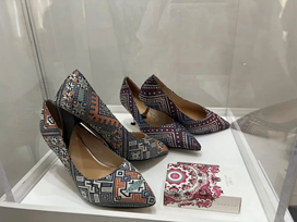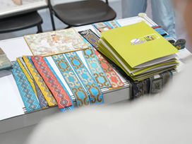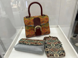 研修班“作品展”以各民族文化和织造技艺为元素,通过现代化的创新设计,再现了符合当代审美的各式作品,设有1个集中展区和6个独立展位:钱锦丝绸、汇明织锦、御秀软装、盐田织彩、南通宣和缂丝和景宁畲族刺绣。集中展区汇聚了以研修班第九期学员为主的20余位学员的特色作品,包括了各类融合各自非遗技艺的墙布、壁挂、桌旗、各种包包、扇子、鞋子和杯垫等文创类产品以及带有民族特色的传统服饰,集中展示传统非遗和时代审美的创新。