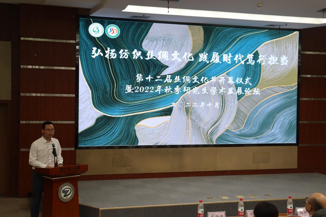 纺织(丝绸)学院党委书记徐伟强致辞,他说,学校和学院在打造丝绸文化方面进行了长期的探索与实践,并指出丝绸文化节蕴含着文化自信、文化自强的浓厚气息,是校园文化育人、红色文化育人、丝绸文化育人的鲜明指向,希望广大同学能投身到纺织丝绸教育中,努力成长为富有实干精神、具有民族气节、自强自信的时代青年。