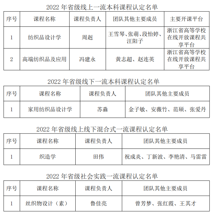 (国际丝绸学院)荣获5门省级一流本科课程的认定。其中,省级线上一流本科课程认定2门,省级线下一流本科课程认定1门,省级线上线下混合式一流课程认定1门,省级社会实践一流课程认定1门。至此,学院共有13门课程获得省级一流本科课程的认定。