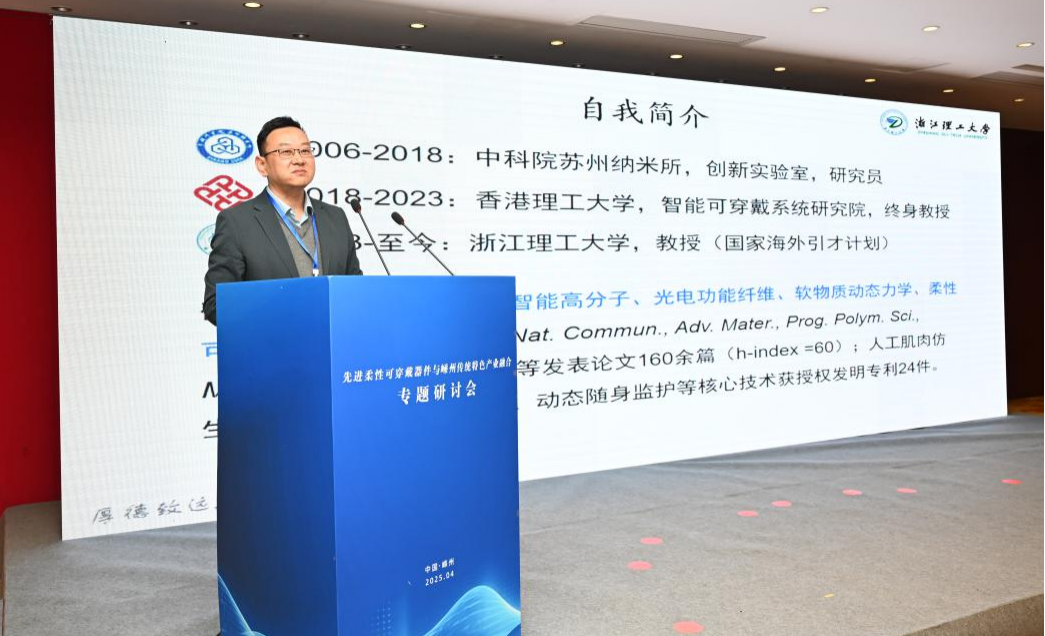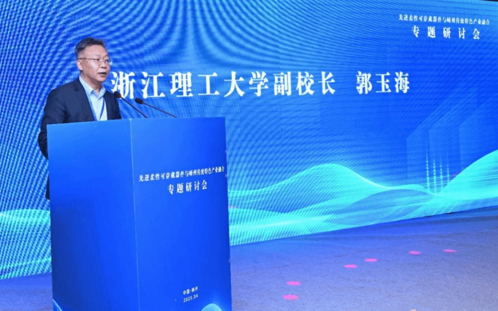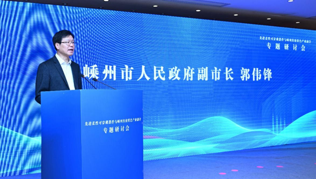 郭伟锋副市长为本次研讨会致辞,郭伟锋代表嵊州市委、市政府,向各位来宾齐聚嵊州表示欢迎。他表示,本次研讨会聚焦“先进柔性可穿戴器件与嵊州传统特色产业融合”,是嵊州推动科技赋能产业、实现跨越式发展的关键举措。柔性可穿戴技术既是全球科技前沿,也是传统纺织服装产业转型的重要突破口。通过产学研深度融合,我们将为嵊州产业注入创新活力,开辟高质量发展新赛道。