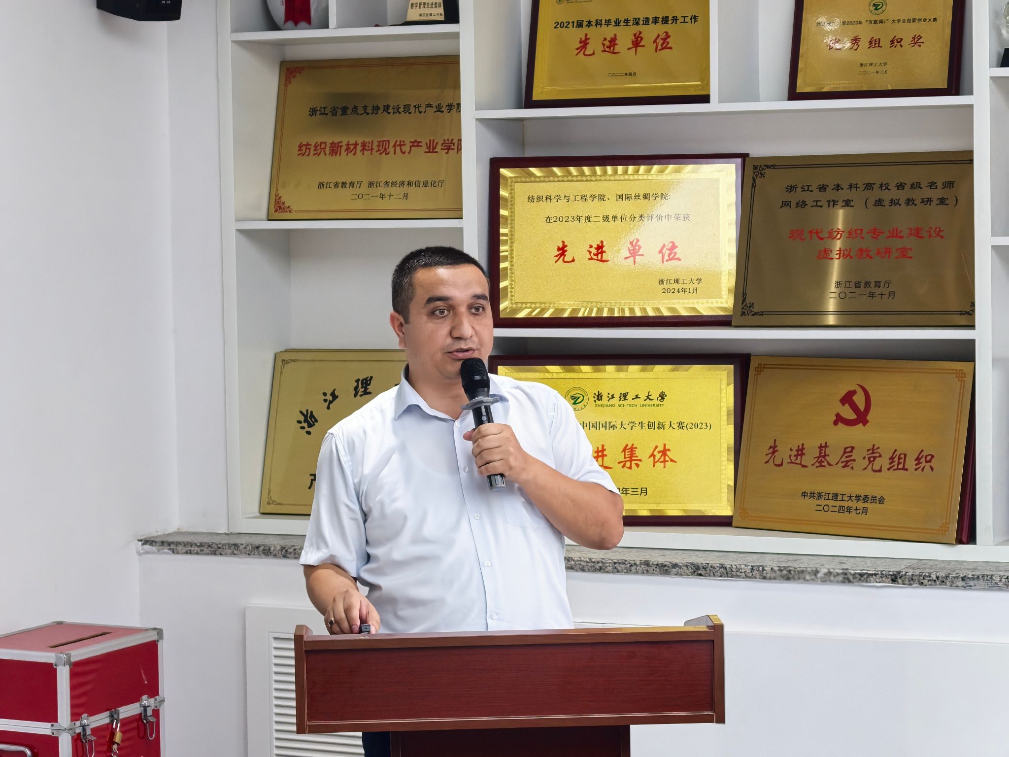 的基本情况、办学历史、国际化工作做了简要的介绍。培训班项目负责人刘国金副院长简要介绍了学院办学历史、专业设置及学院国际交流合作等方面内容。塔什干纺织与轻工业学院化学系系主任Davlatov Bekzod教授简单介绍学校,希望双方未来开展师生交流互访,以丝绸文化为媒,促进两校科技人文交流。此外,项目班主任王琰老师就培训班的教学安排作了详细的介绍。