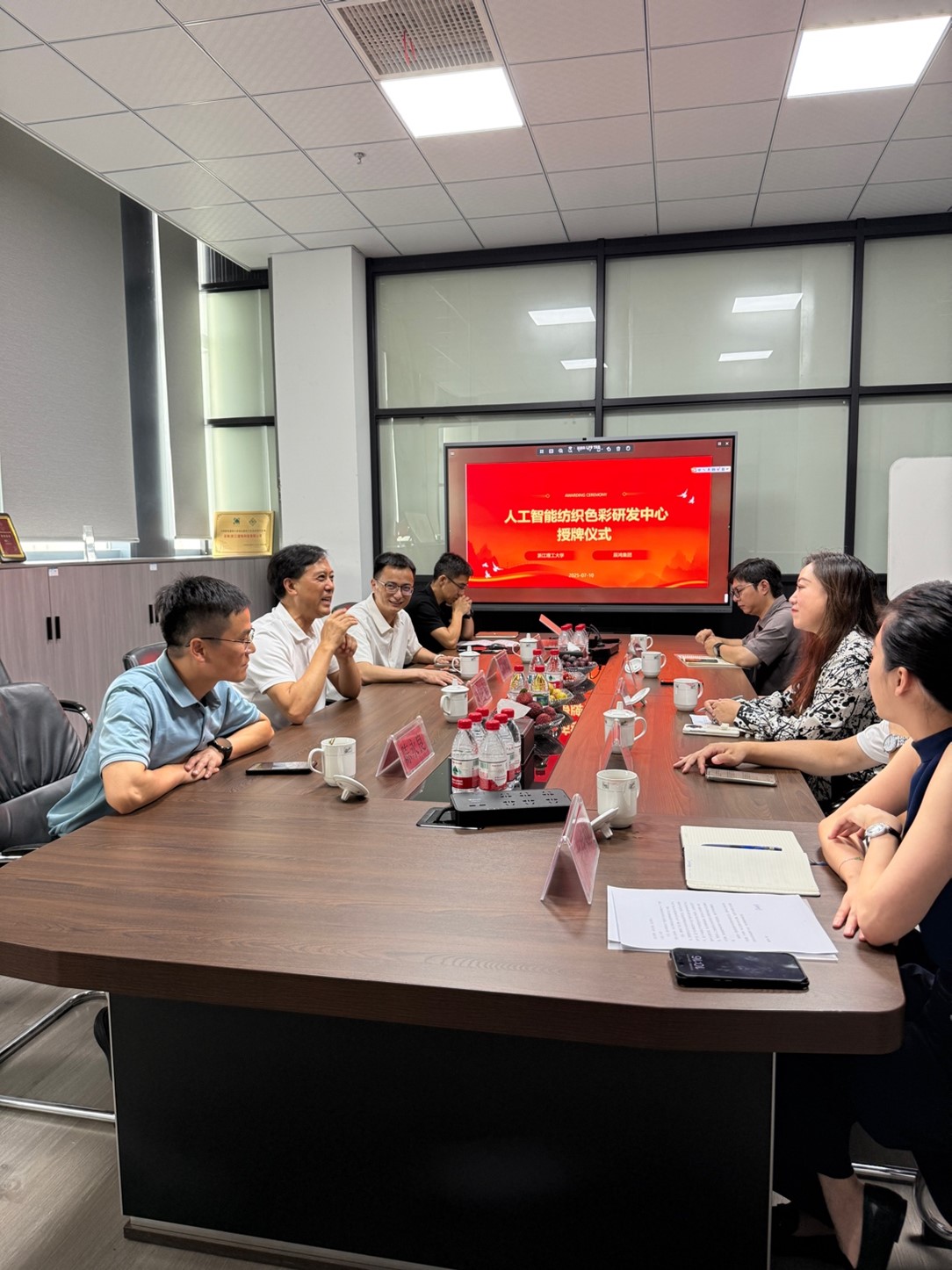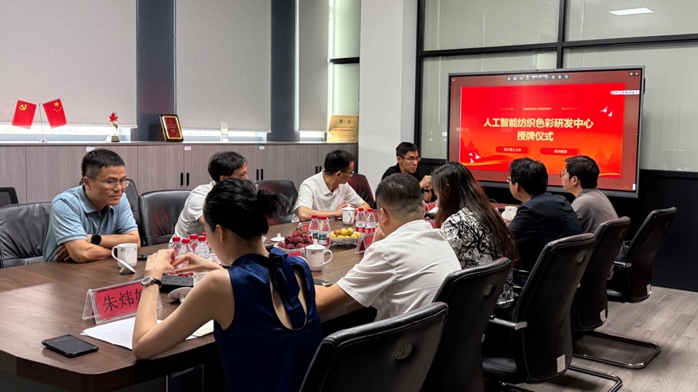 在全体嘉宾的共同见证下,苏淼教授、王建国副局长、柯俊副主任与许生军董事长共同为“人工智能纺织色彩研发中心”揭牌,标志着这一重要合作正式扬帆起航。随后的座谈交流环节中,政府、学校及企业代表围绕“人工智能赋能历史经典产业”主题展开热烈讨论,就未来深化合作方向达成多项共识。