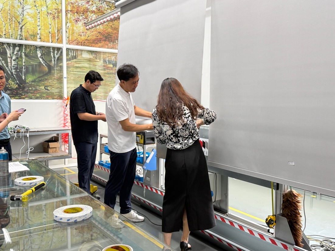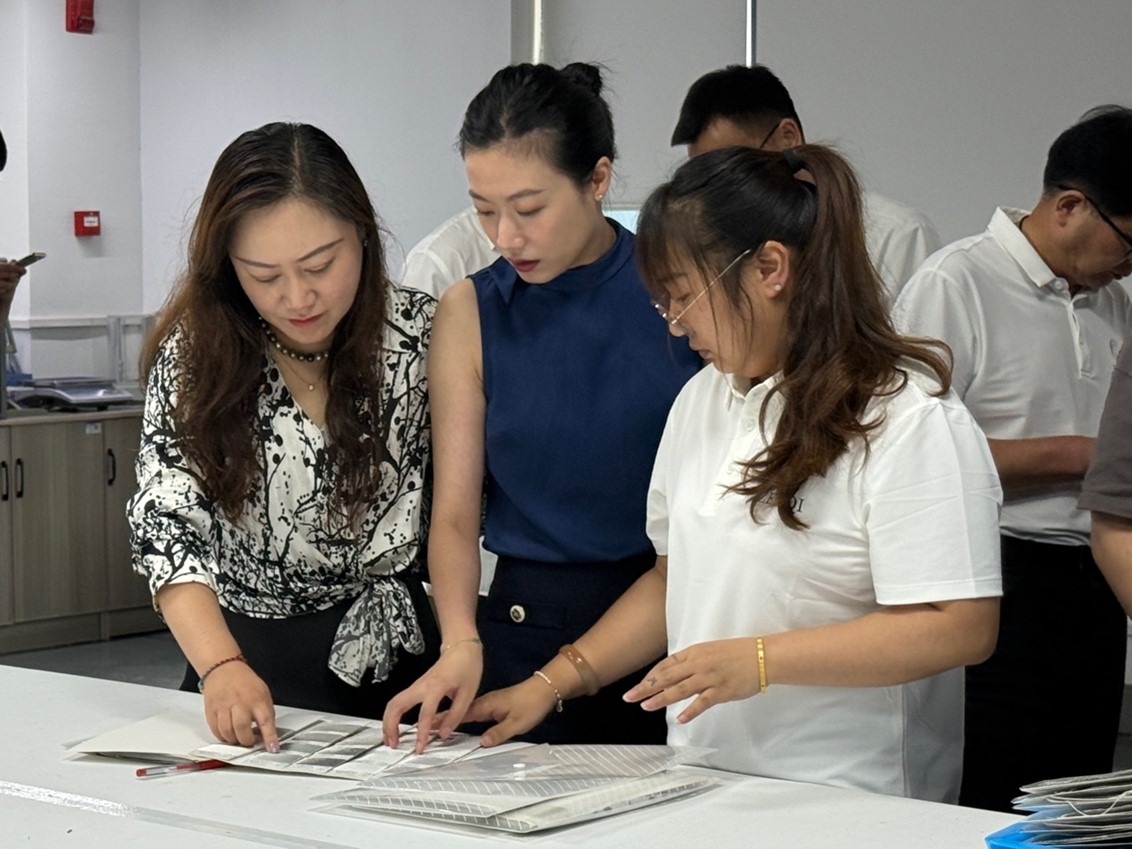 项目负责人朱炜婧老师现场解读了中心牌匾的设计内涵:标识融合校企主色,传承积淀,彰显特质。不同透明度色块排列呼应辰鸿遮阳面料的光影律动;叠加渐变象征AI色彩预测算法的多层融合。简洁而富有科技感的设计,诠释了产学研协同创新的精髓,寓意共同开启智能纺织色彩研发的新征程。