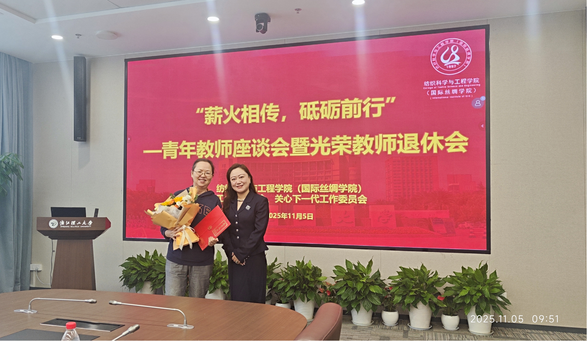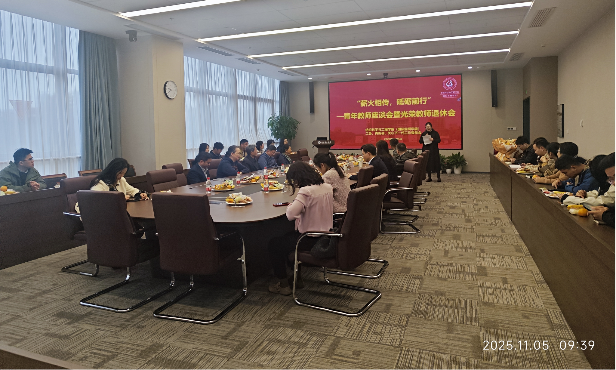 (国际丝绸学院)尊师重教的优良传统,致敬荣休教师的卓越贡献,激励青年教师扎根教坛、奋发有为,纺织学院(丝绸学院)于11月5日上午,在尚+大楼301会议室举办“薪火相传,砥砺前行”青年教师座谈会暨光荣教师退休会。资深教师代表李茂松、陈慰来、王银燕、杨斌、唐志荣出席会议,学院党委书记苏淼、院长于斌、副院长刘国金、学术副院长朱斐超、工会主席王金凤和青年教师代表30余人参加本次活动,致敬荣休岁月,传承师道初心,共绘发展蓝图。