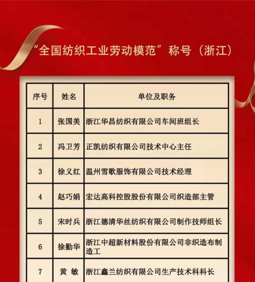 (国际丝绸学院)校友、18届纺织工程专业研究生黄敏荣获“全国纺织工业劳动模范”称号。