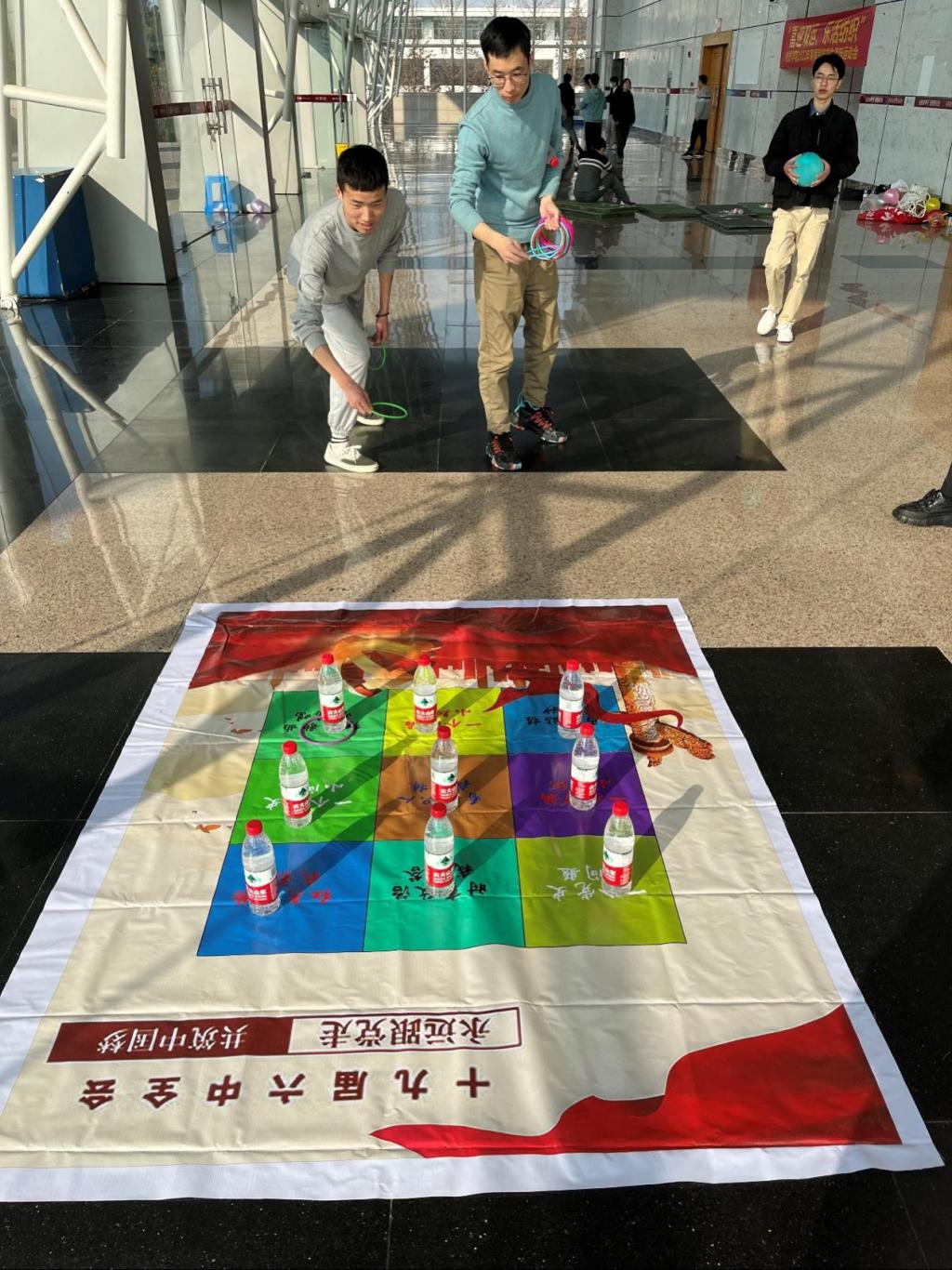 趣味运动会现场,参赛学生通过抽签进行分队并以小组为单位开展趣味运动会比赛。各项比赛采取积分制,以积分高低决出各参赛队伍的排名。跳长绳、拔河、螃蟹接力赛跑、摸水瓶以及同心击鼓等活动,既考验学生身体素质的全面性,也注重团队搭档配合的默契性,各参赛小分队凭借娴熟的小组配合、精妙的通关策略、坚韧的比赛意志,取得了良好体验感。在繁重的科研任务中调节了自身心情,锻炼了身体素质,收获了满满的同窗情。除此之外,活动筹备组还把党的十九届六中全会的有关知识点融入其中,做到了不仅动手,而且还动脑,进一步加深了学生对强智与强身并行的认同感。