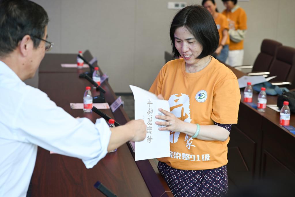 最后,陈爱喜与染整91班班主任姜坪交接了校友们的入校学籍卡,并由姜坪一一发放。