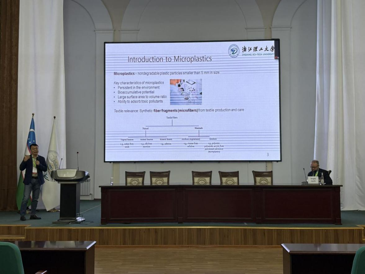 来自全球十多个国家和地区的专家学者齐聚一堂,开展深入研讨。在大会主旨报告环节,人妻 (国际丝绸学院)朱晓敏研究员应邀作《纺织品行业中的微塑料:来源、影响与可持续解决方案》报告。朱晓敏研究员系统阐释了纺织行业微塑料释放的四大途径深入分析了微纤维释放对环境的影响提出了一套完整的可持续解决方案体系:开发新型生物基纤维、优化织造与后整理工艺、优化纺织品洗涤过程、推动纺织产业链绿色转型。朱晓敏研究员的报告激起了与会专家的浓厚兴趣,来自意大利、俄罗斯、日本等国的学者就纤维微塑料的表征方法、标准体系及可降解纺织材料产业化路径进行了深入交流与探讨,并表达了未来在绿色纺织领域共同开展合作的意愿。