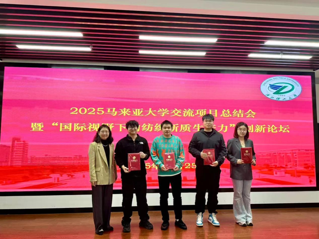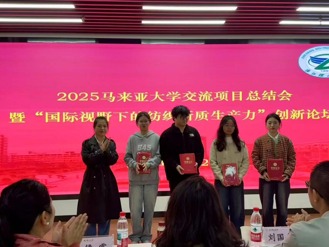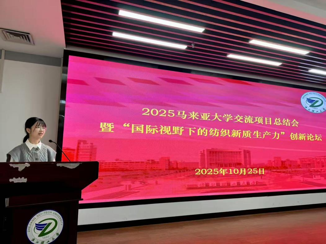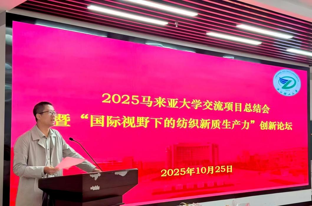 在致远厅召开了2025马来亚大学交流项目总结会暨“国际视野下的纺织新质生产力”创新论坛,学院副院长刘国金,学术副院长宋凯利,学工办主任侯霞,外事秘书倪端,专任教师孙菲、侯雪斌、翟世民、朱维以及参加交流项目的同学们共同出席了本次会议。
