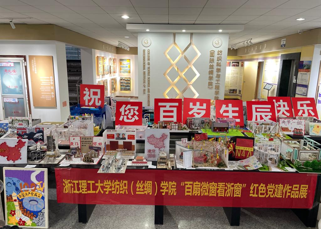 大学纺织(丝绸)学院一楼展示了近百扇“红”意盎然、丝韵动人的橱窗作品,展现了浙江打造重要窗口,建设共同富裕示范区的微观风貌,引来众多学生旁观拍照留念。